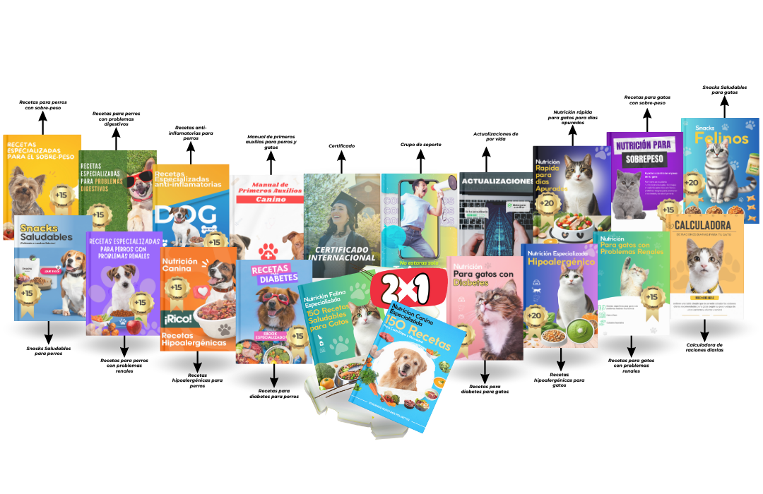Con el MEGA PACK +450 Recetas Saludables para Perros y Gatos, no solo recibes recetas naturales y organizadas, sino también guías claras, bonos prácticos y herramientas creadas para que alimentes mejor a tus peludos desde hoy, con seguridad y sin enredos.